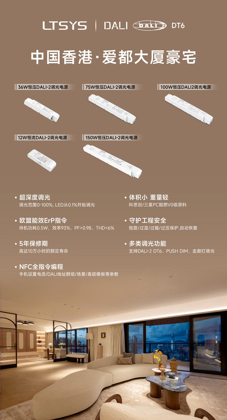 自2005年起,雷特便深耕DALI技术研发领域,不仅构建了丰富的DALI产品线,更以DALI董事会成员身份深度参与行业标准制定。本案中,应用了雷特150W/100W/75W/36W恒压电源及12W恒流电源的DALI-2调光产品矩阵。